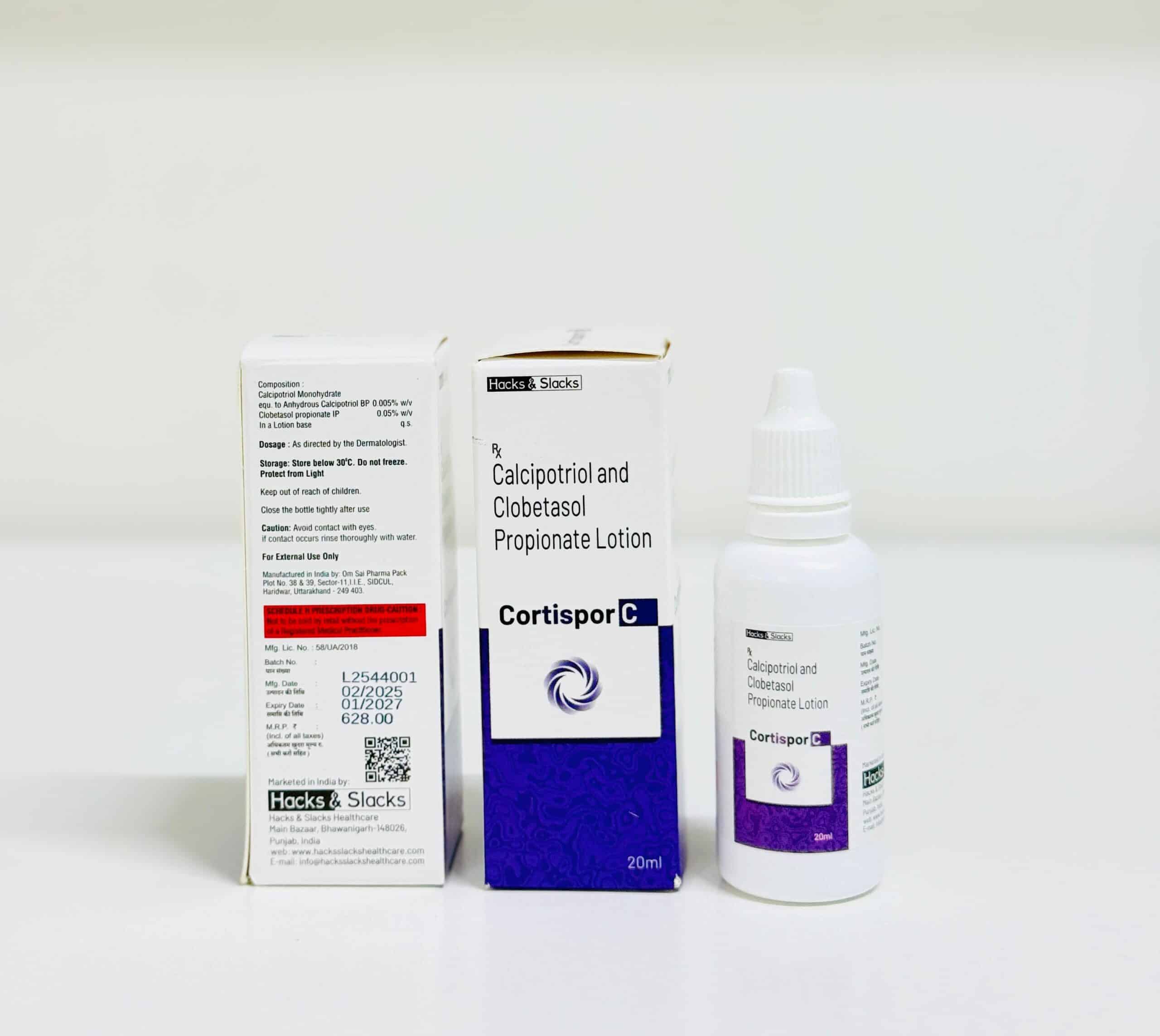 Cortispor C Lotion is the combination of Calcipotriol and Clobetasol Propionate, which is used to treat psoriasis and relieve the red bumpy patches, itchiness and redness.