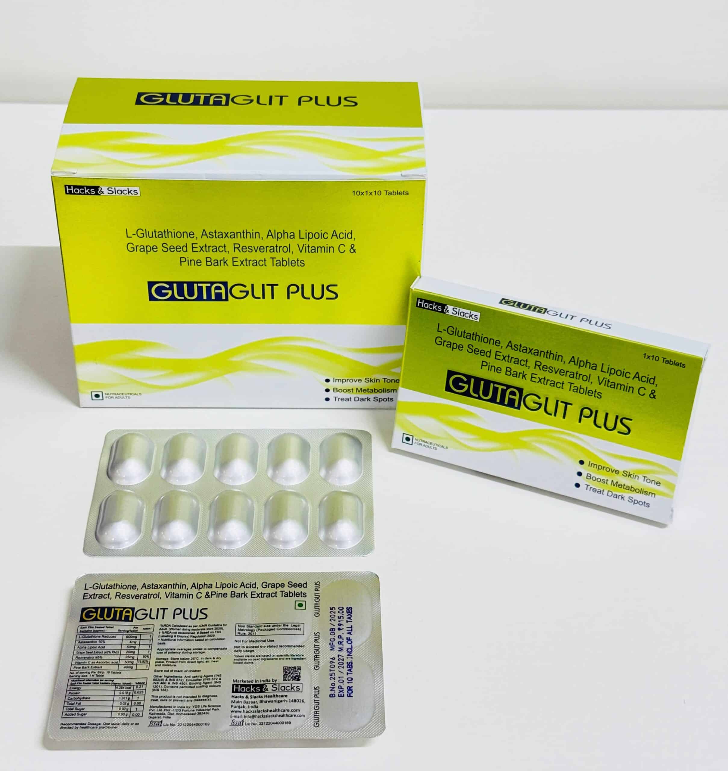 Glutaglit Plus is intended to enhance general health by supplying vital nutrients and antioxidants. It is a dietary supplement. It contains the potent antioxidant L-glutathione, which aids in controlling oxidative stress and cellular damage. By boosting skin radiance and supporting immunological health, the inclusion of vitamins C and E increases its efficacy.